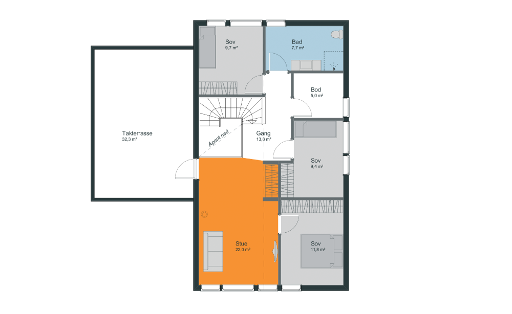 Runde er en elegant og tidsriktig enebolig med moderne formspråk og karakteristiske takform. Inngangen er via carporten; her går du tørrskodd fra bilen og inn. I hallen i 1. etasje er det åpen himling helt opp til taket noe som gir en fantastisk romfølelse. Fra hallen fører en åpen trapp opp til 2. etasje. På hovedplanet i 1. etasje er det vaskerom med egen bi-inngang, bad, stue med åpen kjøkkenløsning og utgang til hagen over- bygget av en sjarmerende pergola. I 2. etasje er det tre soverom, bod, stort bad og stue med utgang til den store terrassen over carporten. Dette kan bli familiens favorittrom. Planløsningen kan enkelt gjøres om slik at kjøkken og stue legges til 2. etasje dersom man ønsker det. Huset kan også tilpasses skrå tomt. Arkitekt: Bent Eddie Lie.